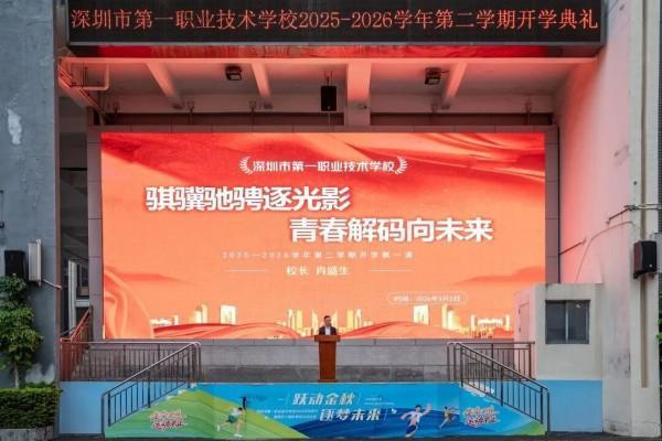 惠风轻拂,草木萌新。3月2日,全体师生踏着轻快的步伐重返校园,在冉冉升起的五星红旗下、在铿锵嘹亮的国歌声中,正式开启新学期的逐梦之旅。我校党委副书记、校长肖盛生以“骐骥驰骋逐光影 青春解码向未来”为题,为全体师生带来开学第一课暨思政第一课。2025年,在全体一职人的努力下,学校书写了高质量发展答卷:学校率先与深圳技术大学携手,开展“3+4”中本贯通培养,实现中职到本科的无缝衔接;与深圳信息职业技术大学、汇川、华为构建“中高企”长学制育人模式,校企合作深度融合,服务产业升级能力迈上新台阶。招生分数创历史新高,平均分达480,位居全市中职学校榜首;春季高考成绩亮眼,全校总分平均分350.38分,本科率达93.3%;学子斩获世界职业院校技能大赛3金1铜;6名学生荣获国家奖学金,瞿雨欣同学作为深圳唯一中职生代表荣登《人民日报》。新学期,新起点,肖盛生校长对全体师生提出了新希望:以梦想为马,奔赴心中最壮美的山水;以技能为蹄,踏出人生最坚实的足迹;以创新为翼,飞向时代最广阔的远方;以生命为光,照亮自
