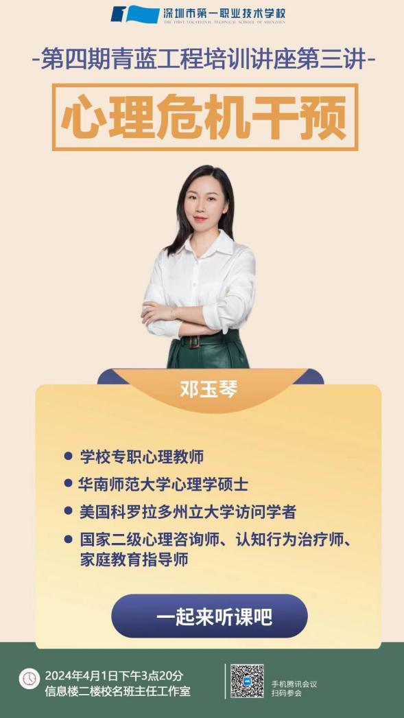 洞察心灵之微,预防危机之萌。4月1日,邓玉琴老师以“心理危机干预”为主题,为第四期“青蓝工程”的学员们带来了一场意蕴深远、启人深思的专题培训。