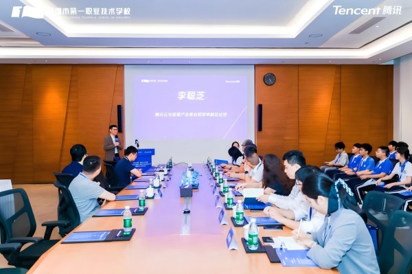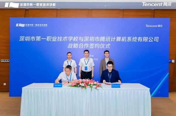 6月10日,深圳市第一职业技术学校(下称深一职)与深圳市腾讯计算机系统有限公司(下称腾讯)在腾讯滨海大厦隆重举行战略合作签约仪式。这是继2021年深一职与腾讯云签订合作协议以来,校企合作对接高端产业蓄力的再一次深度合作,也是校企双方深化产教融合、推动深圳职业教育高质量发展的又一重要实践。市教育局职业与终身教育处处长唐飞,腾讯云与智慧产业事业群深圳副总经理李聪芝,深一职党委副书记、校长肖盛生,纪委书记、副校长卢曙红,相关部门负责人以及计算机部25名学生代表参加仪式。