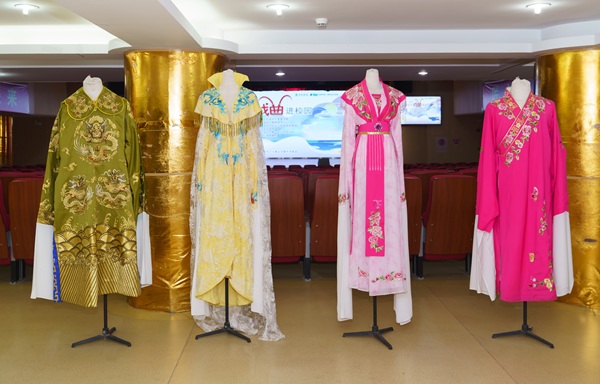 在台下,越剧艺术长廊、百年戏服、头饰、乐器展览吸引学子驻足。一针一线的苏绣戏服、玲珑点翠的头面,无声诉说着越剧的精致与传承。