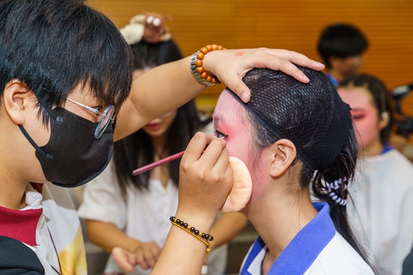 化妆间内,专业化妆师现场演示“黛玉眉”“宝玉冠”,学生亲身体验勾脸、贴片、戴头饰,感受“台下十年功”的匠心。
