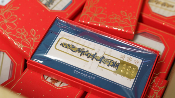 当老师们带着精心准备的礼物走进教室时,同学们眼中满是惊喜。这份专属礼物承载着艺术设计部全体师生的期许——由老师们精心定制、印有暖心加油祝福语的书签,每一张书签都独一无二,既有“笔锋所至,梦想开花”的期许,也有“心之所向,未来可期”的鼓励,将老师们的用心与温情镌刻其中。